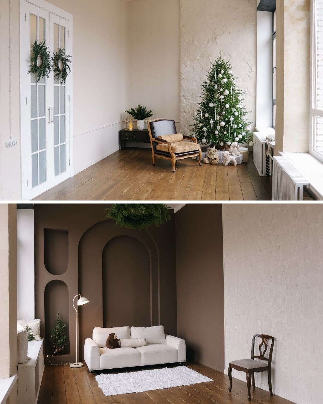 ▪ Белая стена со скальным рельефом, арочная белая стена, сочетание разных фактур, серый тканевый фон.